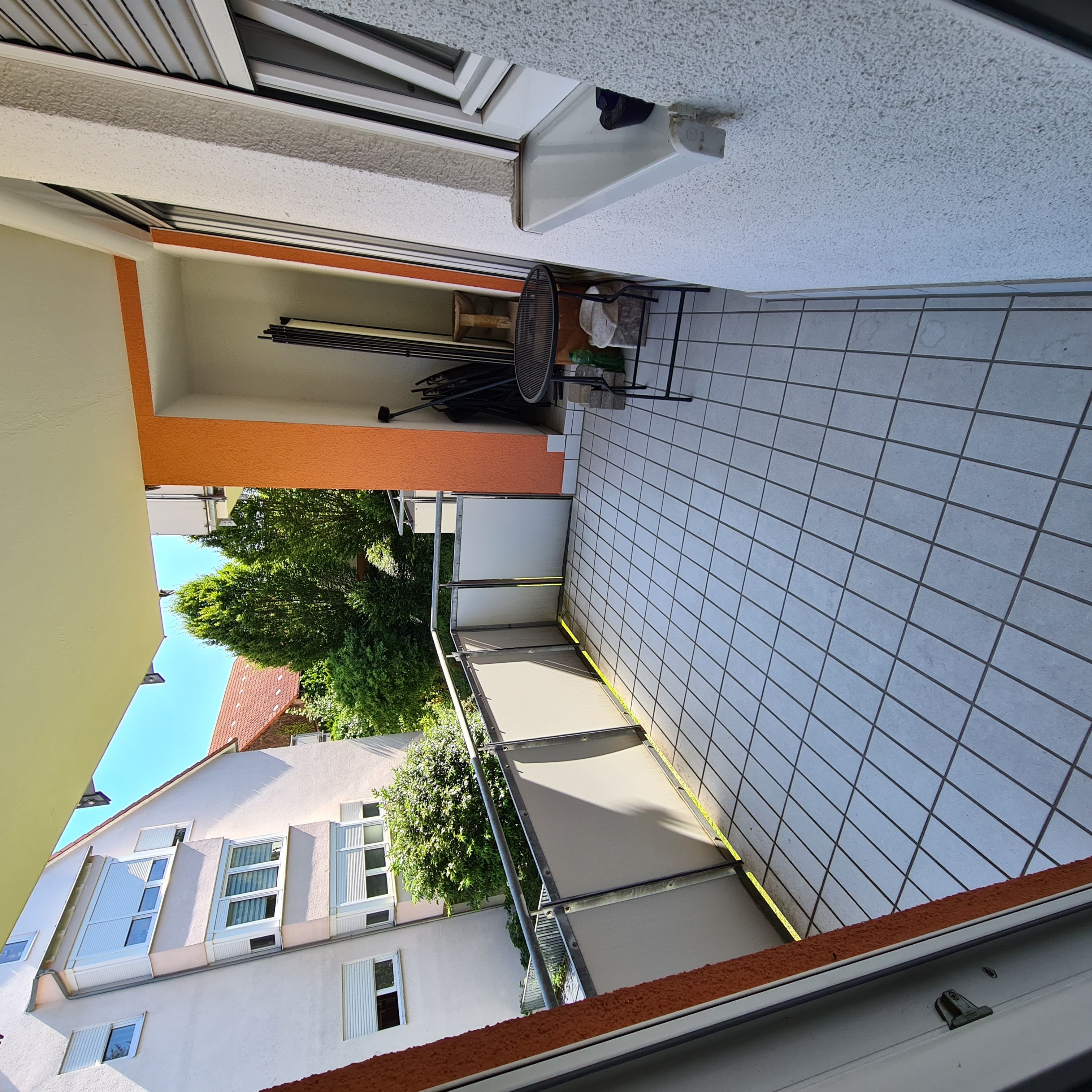 Der nach Südost ausgerichtete Balkon mit geschützter Abstellnische ist sowohl vom Wohnzimmer als auch vom Schlafzimmer aus zugänglich und bietet eine großzügige Freifläche mit teilweise überdachter Fläche.